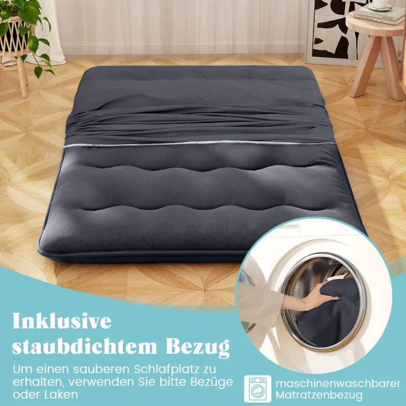 Tato multifunkční matrace jistě zlepší kvalitu vašeho života. Tato matrace může sloužit nejen jako podlahová futonová matrace, ale také jako podložka tatami, dětská hrací podložka, podložka na spaní nebo kempingová matrace. Výplň z polyesteru s vysokou hustotou a potah z měkké tkaniny z mikrovlákna jsou klíčem k vašemu maximálnímu pohodlí a relaxaci. Vnější potah matrace s hladkým zipem lze navíc sejmout pro snadné praní. Pokud se futonová matrace nepoužívá, lze ji srolovat, zajistit bandážemi a uložit do přenosné tašky. Vlastnosti: Vhodné pro použití v domácnosti, kde je matrace vyrobena z materiálu s vysokým obsahem tuku: Používání je pohodlné a spolehlivé: Potah i materiály jsou pečlivě vybrány pro dlouhodobé používání. Futonová matrace je vyplněna polyesterem s vysokou hustotou, má dobrou pružnost a dokáže dokonale podepřít vaše tělo. Vynikající prošívání pomáhá rovnoměrně rozložit výplň a poskytuje větší pohodlí. Snímatelný potah, který lze prát v pračce: Vnější potah s hladkým zipem lze sejmout pro snadné opláchnutí. Prachotěsný potah výrazně zvyšuje životnost matrace a také usnadňuje každodenní péči. Všestranné použití: Podlahová matrace se vyznačuje velkou přizpůsobivostí a je ideální jako přenosné lůžko na spaní nebo hrací podložka pro přespání, sportovní aktivity a děti. Lze ji také použít jako podlahovou matraci futon v ložnici, jako podložku tatami v obývacím pokoji nebo jako kempingovou matraci. Součástí balení: Balení obsahuje 1 futonovou matraci, 1 prachový potah na matraci, 2 bandáže a 1 tašku na přenášení. Pro snadné skladování a přepravu lze rolovací podlahovou matraci zajistit popruhy a uložit do přenosné tašky. Zvláštní údaje & Velikost: Futonová matrace je dodávána ve stlačené roli a je dodávána v kartonové krabici pro snadné doručení a sestavení. Po otevření krabice vyčkejte 48 hodin, než se matrace zcela rozloží. Vlastnosti: Matrace je vybavena speciální konstrukcí, která je součástí balení: Dodává se ve stlačené roli a do 48 hodin se rozloží do původního tvaru Polyesterová čalouněná futonová matrace &; měkký potah pro větší pohodlí Vynikající prošívací proces zajišťuje delší životnost Snímatelný potah matrace se zipem pro snadné oplachování Nehořlavý potah z mikrovlákna nezanechává obavy o spolehlivost při používání Používá se jako podlahová futonová matrace, podložka na hraní, tatami nebo kempingová matrace Srolujte futonovou matraci a zajistěte ji bandážemi Přenosná taška pro snadné skladování &; přepravu Ideální pro dům, karavany, koleje a byty atd.