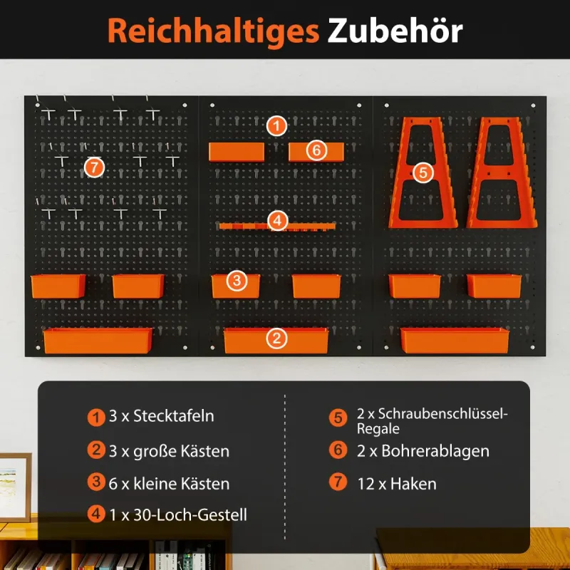 Proměňte svůj pracovní prostor s tímto všestranným nástěnným organizérem s děrovanou stěnou, který kombinuje efektivitu a styl. Tato sada na nářadí obsahuje 9 boxů, držák na 30 otvorů, 2 držáky na klíče, 2 držáky na vrtáky a 12 háčků pro přehledné pracovní prostředí. Přizpůsobitelné uspořádání s pravidelně rozmístěnými otvory splňuje různé potřeby. Snadno sestavitelná konstrukce navíc optimálně využívá vertikální prostor – ideální pro garáže a dílny, ale také pro lepší organizaci v pracovních nebo řemeslných místnostech. Vneste do svého prostoru pořádek s touto dobře navrženou stěnou na nářadí. Vlastnosti: Bohaté příslušenství: Stěna na nářadí obsahuje několik držáků na nářadí: 3 velké boxy, 6 malých boxů, držák na 30 otvorů, 2 držáky na klíče, 2 držáky na vrtáky a 12 háčků – ideální pro rozmanité potřeby skladování. Vybraný materiál: 9 úložných boxů je vyrobeno z vysoce kvalitního PP bez nepříjemných pachů. 3 děrované stěny a příslušenství jsou vyrobeny z robustního kovu s plastovým povlakem pro dlouhou životnost. Nastavitelné uspořádání: Díky pravidelně rozmístěným otvorům na děrované desce umožňuje stěna na nářadí flexibilní umístění příslušenství a umožňuje vám přizpůsobit si úložný prostor individuálním potřebám. Prostorově úsporný design: Předvrtané montážní otvory umožňují snadné připevnění stěny na nářadí k jakékoli zdi a efektivně využívají vertikální prostor pro snížení nepořádku v garáži nebo dílně. Nejen pro nářadí: Tato dílenská stěna je vhodná nejen pro organizaci nářadí, ale je ideální také do dílen, ateliérů nebo řemeslných prostor – všestranné řešení pro mnoho předmětů. Vlastnosti: Obsahuje 26 závěsných kusů. Úhledné úložné prostory pro klíče, kladiva, šroubováky a vrtačky. 9 úložných boxů vyrobených z vysoce kvalitního PP. Hlavní tělo a většina příslušenství vyrobeny z odolného kovu. Všechny háčky a držáky lze volně uspořádat dle potřeby. Montáž na stěnu šetří spoustu místa. Ideální také do dílen, uměleckých nebo řemeslných místností. Snadná instalace díky předvrtaným otvorům.