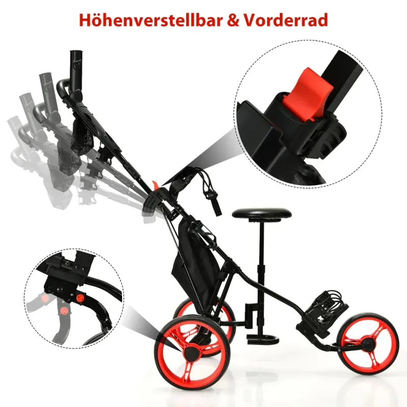 Náš golfový vozík je praktický společník! Ocelový rám je lehký, ale velmi robustní a může přepravovat pytle různých velikostí. Díky tomu a praktické úložné tašce a síťované kapse budete mít vždy po ruce všechny potřebné věci, například nápoje. Na sedadle si můžete také odpočinout. Do držáku, který je k tomuto účelu k dispozici, lze připevnit deštník, který vás ochrání před sluncem. Díky tomu je tento golfový vozík velmi praktický. Vlastnosti: Jednoduché skládání: Sedadlo golfového vozíku je odnímatelné. Vozík lze složit a rozložit během několika vteřin stisknutím tlačítka. Potom zabírá jen velmi málo místa a dá se snadno uložit. Nastavitelná rukojeť a sedadlo: Tento golfový vozík má ergonomicky nastavitelnou výšku rukojeti a sedadla a lze jej nastavit v rozsahu 99 - 116 cm, takže je vhodný pro uživatele všech výšek (teenagerů a dospělých). Dostatek úložného prostoru: Tento funkční vozík je vybaven stojanem na deštník, který chrání před sluncem a deštěm. Golfové příslušenství lze uložit do tašky a teplé nebo studené nápoje lze uchovávat na vnější straně. Robustní kovový rám: Vozík se 3 kolečky je vyroben z robustního kovu a je vybaven elastickými popruhy, které bezpečně upevní jakýkoli bag. Má také elegantní vzhled. Odolná kola a brzdy: Materiál kol PP a pneumatiky EVA lze přizpůsobit terénu a kuličková ložiska zajišťují jízdu bez námahy na jakémkoli povrchu. Brzda zajišťuje bezpečné stání. Vlastnosti: Vhodný pro všechny, kteří se chtějí opřít o kolo: Robustní ocelová konstrukce s vysokou nosností Kola z materiálu EVA odolná vůči opotřebení, použitelná na jakémkoli povrchu Držáky s elastickými popruhy na golfové pytle různých velikostí Nastavitelné rukojeti, vhodné pro různé tělesné velikosti mechanismus pro bezpečné zastavení bez sklouznutí Nastavitelný držák na deštníky, vybavený vodotěsnou úložnou taškou S výsledkovou tabulí, na které si můžete zapisovat skóre Obsahuje držák na sklenice, ideální pro vaše sklenice a láhve Rukojeť s pogumovaným povrchem pro ergonomii elastickým polstrováním pro pohodlí Přední kolečko otočné o 180° pro snadný pohyb a řízeníTechnické údaje: Barva: červená + černá Materiál: ocelový rám + PP + EVA kolečka Celkové rozměry: 129,5 x 75 x 101,5-119,5 cm (D x Š x V) Průměr předního kola: 24 cm Průměr zadního kola: 26,5 cm Nastavitelná výška sedáku: 101,5 - 119,5 cm Čistá hmotnost: 8 kg Nosnost sedáku: 100 kg Rozsah dodávky: 1 x golfový vozík 1 x návod k použití