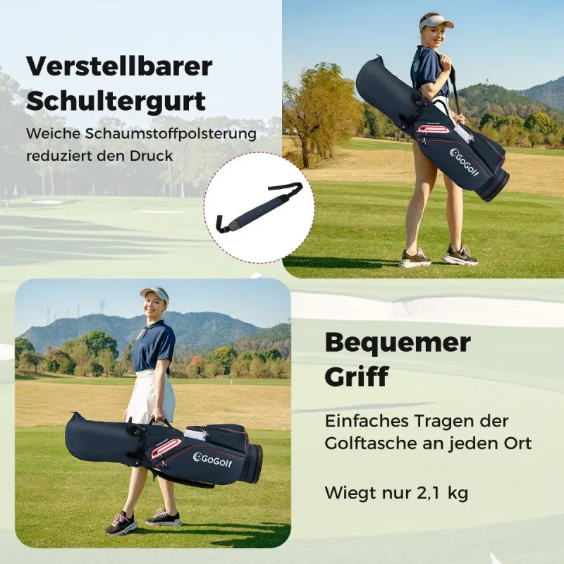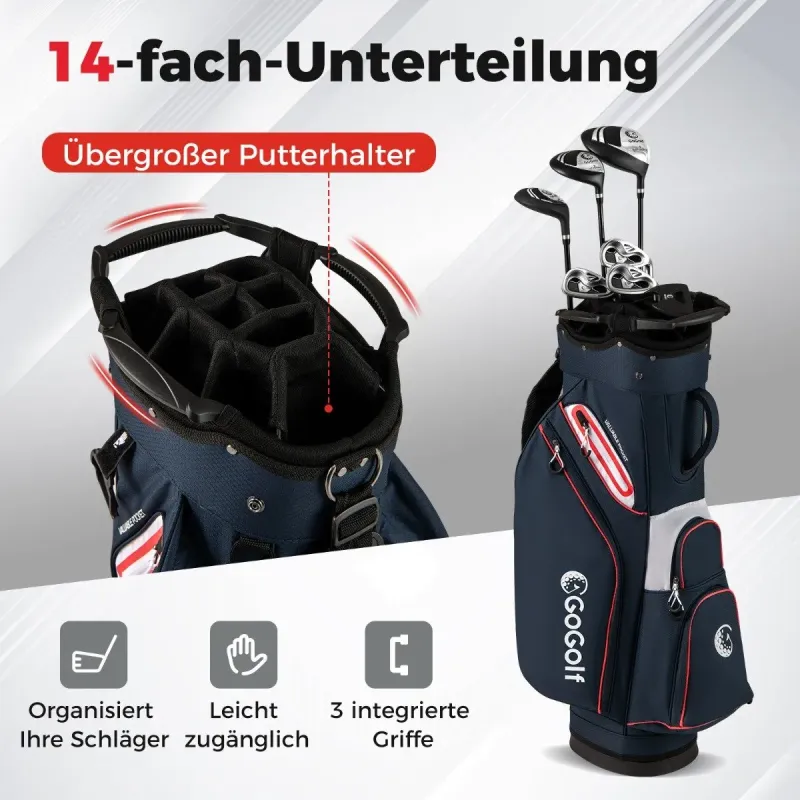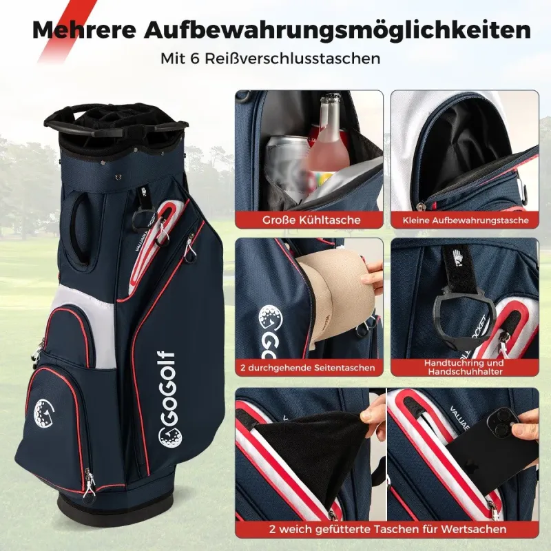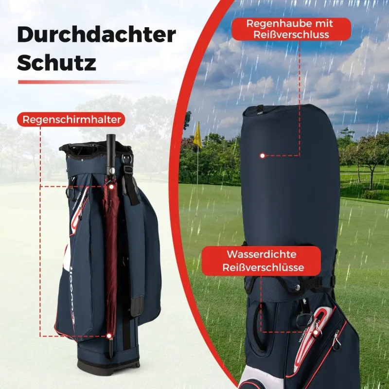 Tento golfový bag má 14cestně dělenou horní část, která pomáhá uchovávat vaše hole úhledně uspořádané a chráněné. Dostatek úložného prostoru zajišťuje 6 kapes na zip, včetně chladicí kapsy, 2 kapes s měkkou podšívkou na cennosti, malé přední kapsy na míčky nebo odpaliště a 2 bočních kapes po celé délce na oblečení. Pláštěnka na zip chrání vaše hole před sluncem a deštěm, zatímco držák na deštník zajišťuje, že budete připraveni na měnící se povětrnostní podmínky. Vlastnosti: 14cestně dělená horní část: Tato taška na golfový vozík má 14cestně dělenou horní část pro optimální organizaci a ochranu vašich holí. Součástí balení je i velký držák na puttery, který umožňuje snadný přístup. Poznámka: Golfové hole nejsou součástí balení. Více možností úložného prostoru: Golfový bag je vybaven 6 kapsami na zip, včetně velké chladicí kapsy, malé úložné kapsy, 2 kapes s měkkou podšívkou na cennosti a 2 bočních kapes po celé délce. Kroužek na ručník a držák na rukavice zvyšují funkčnost a poskytují rychlý přístup k příslušenství. Pohodlí se setkává s mobilitou: Tento lehký golfový bag váží pouhých 2,1 kg. Díky nastavitelnému ramennímu popruhu s měkkým pěnovým polstrováním je tato taška snadno přenosná. Tři integrované horní rukojeti a boční pohodlné madlo navíc umožňují snadnou přepravu. Důkladná ochrana: Tato taška na golfový vozík je vybavena pláštěnkou na zip a držákem na deštník, takže je připravena na všechny povětrnostní podmínky. Voděodolné zipy navíc zajišťují bezpečné uchycení vaší výbavy a udržují vaše věci v suchu. Zvýšená odolnost: Tato taška na golfové hole je vyrobena z polyesterové tkaniny odolné proti roztržení a opotřebení a nabízí dlouhou životnost. Protiskluzová základna zajišťuje stabilitu a je vhodná pro různé golfové vozíky. Vlastnosti: 14cestná horní přepážka pro organizaci a ochranu vašich holí 6 kapes na zip nabízí dostatek úložného prostoru Chladicí taška udržuje nápoje na hřišti v chladu 2 kapsy s měkkou podšívkou pro uložení telefonu, peněženky a klíčů Nastavitelný ramenní popruh s měkkým pěnovým polstrováním snižuje tlak Vestavěné rukojeti zajišťují pohodlné nošení v případě potřeby Odnímatelná pláštěnka pro ochranu holí za všech povětrnostních podmínek Součástí je držák na rukavice, kroužek na ručník a držák na deštník