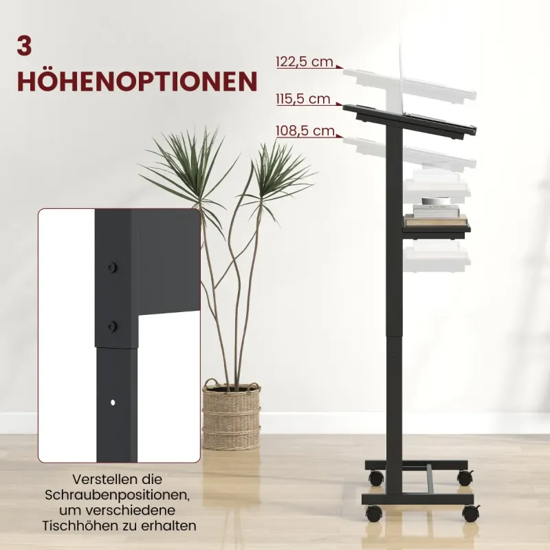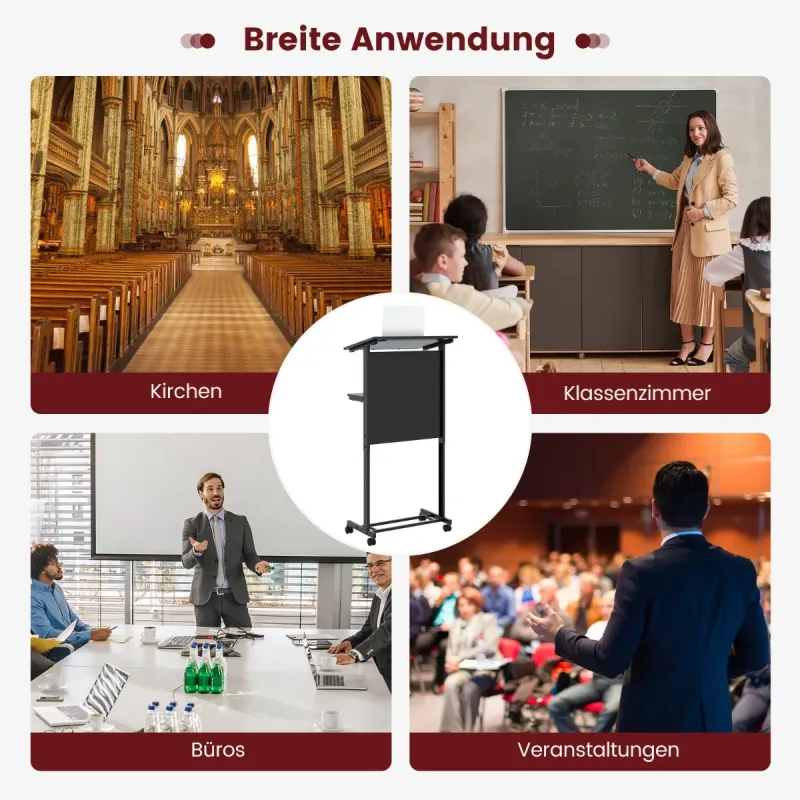 Objevte elegantní, mobilní a nastavitelný pult, který je ideální pro každé místo – od vaší domácí kanceláře až po třídu. Už nebudete mít problémy, jako jsou bolesti zad nebo nepořádek, protože tento pult lze nastavit do 3 výšek a je vybaven inteligentním sklonem pro čtení bez námahy. Udržujte své poznámky v bezpečí pomocí praktické okrajové zarážky a další materiál si uložte do přídavného úložného prostoru. Už vás nebaví zamotané kabely? Tento problém vyřeší integrovaný otvor pro kabel. Bez námahy se posouvejte z jedné místnosti do druhé na robustních kolečkách a zajistěte je na místě, když je čas začít svůj úkol. Náš profesionální, přenosný a připravený reproduktorový stůl je navržen tak, aby vylepšil jakoukoli prezentaci. Posuňte svůj profesionální image na vyšší úroveň! Vlastnosti: Profesionální vzhled: Udělejte dojem při jakémkoli projevu nebo prezentaci s všestranným stolem navrženým pro domácnost, kancelář, třídu nebo kostel. Jeho čisté linie a elegantní povrchová úprava dodávají prostředí nádech elegance a profesionality. Nastavitelný pro optimální pohodlí: Stůl na stání má 3 možnosti nastavení výšky dle vaší postavy a zajišťuje ergonomický komfort. To vám pomůže najít dokonalé držení těla, díky čemuž bude každá interakce vzrušující a méně stresující. Zabezpečte své pracoviště: Stolová deska stojícího stolu, která je nakloněna o 11°, nabízí optimální pozorovací úhel a snižuje tak namáhání krku a očí. Navíc, promyšlený design okrajové zarážky udrží vaše poznámky a zařízení bezpečně na místě. Optimalizuje vaše nastavení: S praktickým přídavným úložným prostorem a integrovaným otvorem pro kabel je pódium navrženo pro efektivnost. Udržujte své materiály uspořádané a svůj pracovní prostor uklizený a vytvořte elegantní obraz, který odráží vaši profesionalitu. Pohybujte se s jistotou: Mobilní stolek na notebook stojí na odolném kovovém podstavci a je připraven k použití se 4 360° univerzálními kolečky včetně 2 uzamykatelných koleček pro stabilitu. Plynule přecházejte z místnosti do místnosti a uvidíte, že tento stojící stůl je ideální téměř do každého prostředí. Vlastnosti: 3 výškové možnosti přizpůsobení potřebám různých skupin uživatelů Umožňuje vám nastavit polohy šroubů, abyste dosáhli různé výšky stolu Ergonomicky nakloněná deska stolu pro pohodlný úhel pohledu Přídavná police pro udržení důležitých věcí na dosah Dostatek prostoru pro značky, sklenice, dálkové ovladače a notebooky Pevný kovový rám zajišťuje spolehlivou podporu Vybaven 2 univerzálními kolečky a 2 uzamykatelnými kolečky pro mobilitu a stabilitu Všestranné použití v kostelech, třídách, kancelářích a na akcích S otvorem pro kabel pro přehledné vedení kabelů Okrajové zarážky zabraňující sklouznutí předmětů Uživatelsky příjemné detaily se zaoblenými rohy pro bezpečné použití