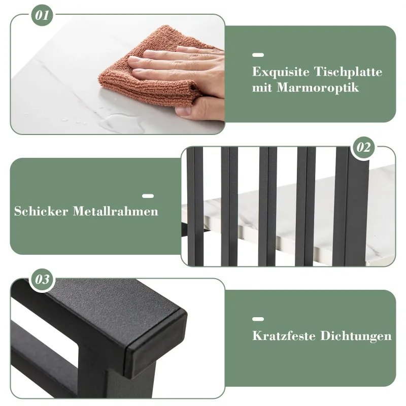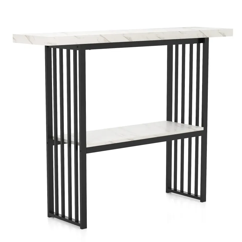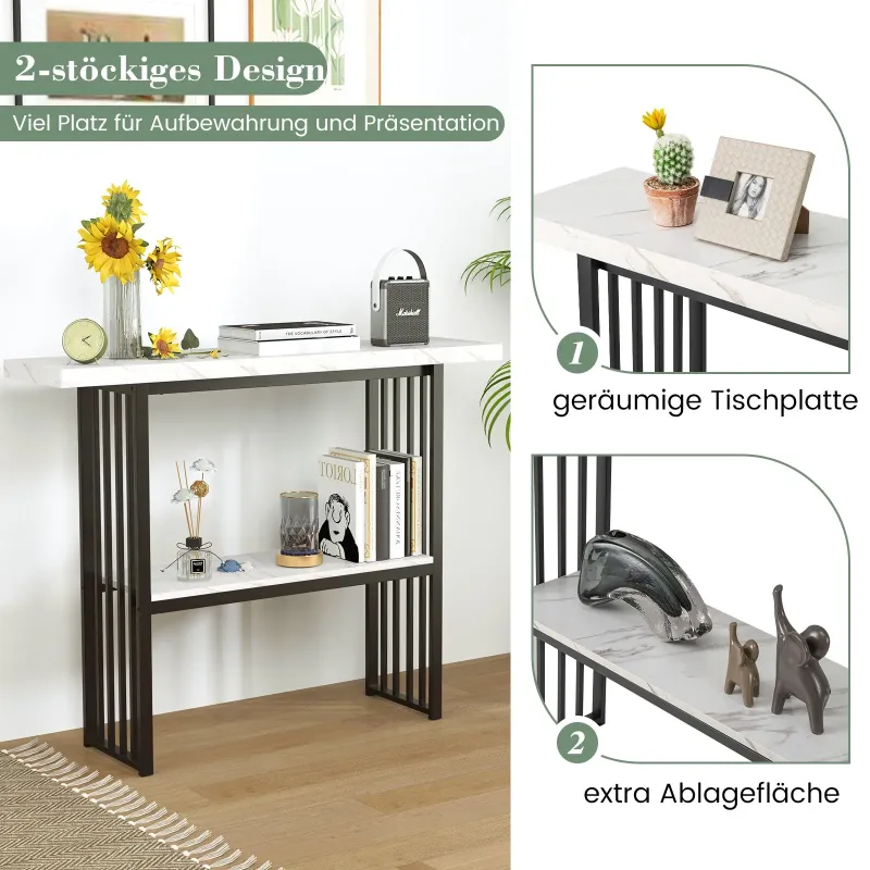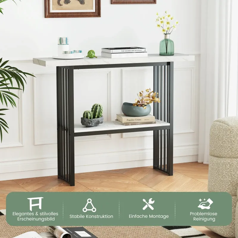 Náš dvoupatrový konzolový stolek dokonale splňuje vaše potřeby úložného prostoru a bude perfektním doplňkem vašeho domova! Kombinuje úložný prostor, dekoraci a vystavení věcí v jednom. Široká deska stolu a spodní police poskytují několik možností úložného prostoru pro širokou škálu předmětů denní potřeby. Díky robustnímu rámu z MDF a práškově lakovaného kovu je tento vstupní stolek stabilní a dostatečně pevný pro dlouhodobé používání. Funkce proti převrácení navíc zajišťuje lepší stabilitu. Náš stylový konzolový stolek z umělého mramoru je kompatibilní s různými styly domácnosti a interiérovými dekoracemi a je ideální jako vstupní stolek, stolek do předsíně nebo konferenční stolek atd. Vlastnosti: Působivý vzhled s umělým mramorem: Konzolový stolek se vyznačuje povrchovou úpravou z umělého mramoru, která kombinuje estetickou krásu s velkou praktičností, a poskytuje dokonalý vizuální efekt a dodává vašemu domovu kouzlo. Zlatý kovový rám také dodává vašemu obytnému prostoru luxusní vzhled, ať už v obývacím pokoji, ložnici, chodbě nebo kdekoli jinde. Dvoupatrová police pro snadné úložné prostory: Deska stolu je dlouhá 120 cm a nabízí prostor pro vázy, sbírky, rostliny a další dekorativní předměty. Spodní police vám mezitím umožňuje nerušený přístup k předmětům, takže se nemusíte obávat nedostatku místa pro uložení a vystavení různých denních potřeb. Robustní konstrukce vyrobená pro dlouhou životnost: Silná MDF deska je navržena pro robustnost a odolnost. Odolné kovové lamely navíc zajišťují vysokou nosnost, díky čemuž je stůl dostatečně robustní pro dlouhodobé používání. Funkce proti převrácení zajišťuje konferenční stolek ke zdi, aniž by se kymácel. Všestranný kompaktní konzolový stolek: Díky svým kompaktním rozměrům a štíhlé konstrukci je konferenční stolek ideální volbou do malých prostor a funguje stejně dobře za pohovkou nebo opřený o zeď. Kromě použití jako stolek k pohovce může sloužit také jako vstupní stolek, stolek do předsíně, konferenční stolek atd. Bezstarostná montáž a čištění: Veškeré potřebné příslušenství a podrobný návod jsou bezpečně zabaleny. Všechny díly snadno zacvaknete. Hladký povrch navíc nezabere mnoho času ani úsilí při každodenní údržbě. Celkové rozměry: 120 cm x 29,5 cm x 92,5 cm (D x Š x V). Vlastnosti: Elegantní design s imitací mramoru dodá vašemu domovu nádech kouzla. Dvoupatrová police poskytuje dostatek úložného prostoru na předměty denní potřeby. Silná deska stolu z MDF je dostatečně odolná pro dlouhodobé používání. Kovový rám s práškovým nástřikem ve zlaté barvě odolává viklání a lámání. Vybaven ochranou proti převrácení, která zabraňuje viklání. Protiskluzové nožičky zabraňují poškrábání podlahy. Perfektní doplněk do obývacích pokojů, ložnic, chodeb atd. Hladká deska stolu se snadno čistí a udržuje. Snadná montáž s návodem.