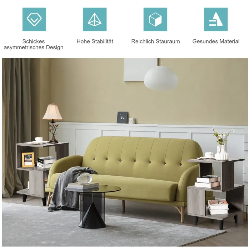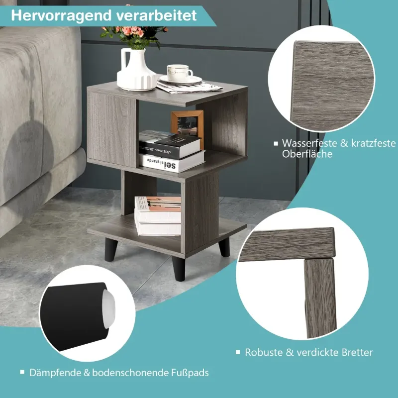 Pokud hledáte poličku pro uložení knih a jiných předmětů, pak vám nesmí chybět náš noční stolek! Náš příruční stolek je vyroben ze zhrublých desek. Vyznačuje se vysokou stabilitou a podepře vaše různé předměty bez deformace konstrukce. dvě úrovně a prostorná horní deska vám poskytnou dostatek úložného prostoru pro uspořádání vašich knih, fotografií a jiných doplňků. Jedinečný asymetrický design je poutačem pohledů, který ukáže váš dobrý vkus. Vlastnosti: Robustní konstrukce: naše dva noční stolky jsou robustně zkonstruovány, přičemž každá police je k sobě pevně připevněna. Kromě toho 4 nožičky poskytují poličce dobrou oporu a dělají ji dostatečně stabilní, aniž by se deformovala nebo převrátila. Dostatek úložného prostoru a prostorově úsporný design: 2 otevřené police a prostorná horní deska vám poskytnou celkem 3 úrovně velkého úložného prostoru pro různé předměty, jako jsou knihy, fotografie nebo jiné příslušenství. Kompaktní rozměry jsou ideální také do rohů nebo malých prostor. Vynikající zpracování pro vysokou kvalitu: Tento volně stojící boční stolek z dřevotřísky splňuje všechny bezpečnostní normy a je spolehlivý pro každodenní používání. Jeho životnost prodlužuje také povrch odolný vůči vodě. Kromě toho podložky pod nohy snižují hluk při pohybu a mohou také chránit podlahu. Elegantní vzhled a všestranné možnosti použití: Tato sada nočních stolků v moderním asymetrickém stylu se hodí ke krásnému dekorativnímu nábytku a nabízí vám estetické efekty. Stolky mohou sloužit jako odkládací police, stojany na rostliny nebo výstavní police v obývacím pokoji, ložnici, předsíni, pracovně, kanceláři atp. Jednoduchá montáž: Díky podrobnému návodu s označenými díly a přehledným ilustracím je montáž hračka. Není zapotřebí žádný složitý postup, montáž regálu snadno dokončíte pomocí běžného nářadí za krátkou dobu. Vlastnosti: Vhodné pro použití v domácnosti: Robustní konstrukce unese velkou hmotnost, aniž by se deformovala Zahuštěné desky se při dlouhodobém používání snadno neohýbají Hladký a voděodolný povrch usnadňuje odstraňování skvrn Velký úložný prostor pro uložení různých předmětů Díky kompaktním rozměrům jsou vhodné do malých prostor Poutavý asymetrický design ozdobí vaše pokoje Jednoduchá montáž podle podrobného návodu Všestranné využití: jako úložný regál, stojan na rostliny nebo noční stolek Podrobné specifikace: Vhodné pro uložení různých předmětů: Rozměry výrobku: 40 x 40 x 64 cm (d x š x v) Čistá hmotnost: 16 kg Nosnost: 15 kg (každá úroveň) Rozsah dodávky: 2 x noční stolek 1 x návod k montáži