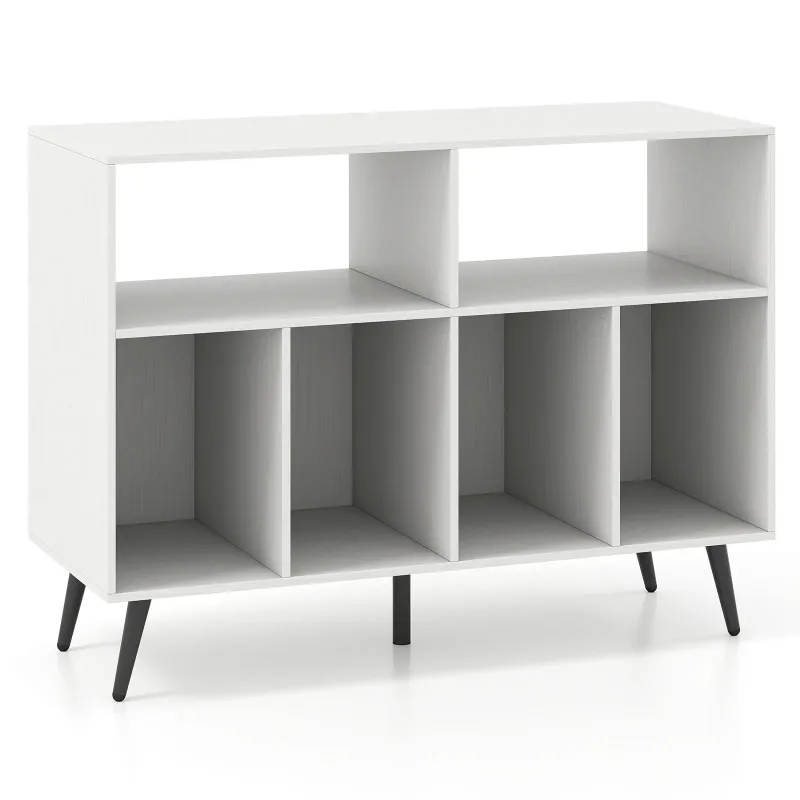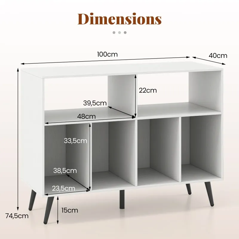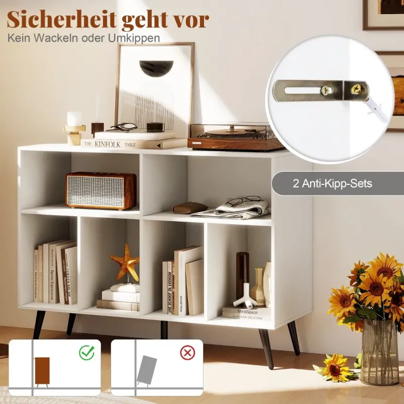 Tento stojan na gramofon má širokou desku stolu pro různé gramofony. Dvě přihrádky poskytují další prostor pro uložení audio příslušenství, časopisů nebo dekorativních předmětů. Níže jsou umístěny čtyři vinylové úložné police, které jsou navrženy tak, aby vaše cenná sbírka byla uspořádaná a snadno přístupná. Tento stojan na gramofon, navržený tak, aby oslovil milovníky hudby a sběratele vinylu, je elegantním doplňkem každé místnosti. Vlastnosti: Všestranné úložné prostory pro vinyly: Tento stojan na gramofon, navržený s ohledem na nadšence do vinylu, má čtyři otevřené police pro pohodlné uložení. Nabízí dostatek prostoru pro uspořádání a vystavení vaší cenné vinylové sbírky a zajišťuje tak uklizenou a stylovou hudební místnost. Více možností úložného prostoru: Obdélníková deska stolu usnadňuje umístění gramofonů a dalšího audio zařízení. Dvě otevřené přihrádky navíc nabízejí další prostor pro knihy, dekorace a mediální zařízení. Spolehlivá konstrukce: Tento stojan na gramofony je vyroben s pěti vyvýšenými podpůrnými nohami a zajišťuje skvělou stabilitu a oporu pro vaše cenné hudební vybavení. Vyvýšená konstrukce navíc usnadňuje čištění podlahy. Bezpečnost na prvním místě: Sady proti převrácení, navržené tak, aby chránily vaše desky a vybavení před náhodnými nárazy nebo pády, představují spolehlivý doplněk vaší audio sestavy. Po umístění ke zdi je otočný stůl stabilní a neviklá. Všestranné použití: Tento otočný stůl slouží také jako stylová výstavní police, ať už v obývacím pokoji, ložnici nebo hudební místnosti. Jeho elegantní design a moderní estetika z něj činí atraktivní poutač, který se krásně hodí do každé místnosti. Vlastnosti: Velká horní plocha a 2 otevřené police doplňují výstavní prostor. 4 přihrádky poskytují dostatek úložného prostoru pro vinylové desky. 4 šikmé kovové nohy a 1 prostřední podpůrná noha pro spolehlivou konstrukci. Vybaven 2 sadami proti převrácení, žádné viklání ani naklánění. Ideální pro gramofony, stereo reproduktory, knihy a dekorace. Dostatek prostoru pro průchod vysavače. Protiskluzové nožičky zabraňují poškrábání podlahy. Nutná montáž.