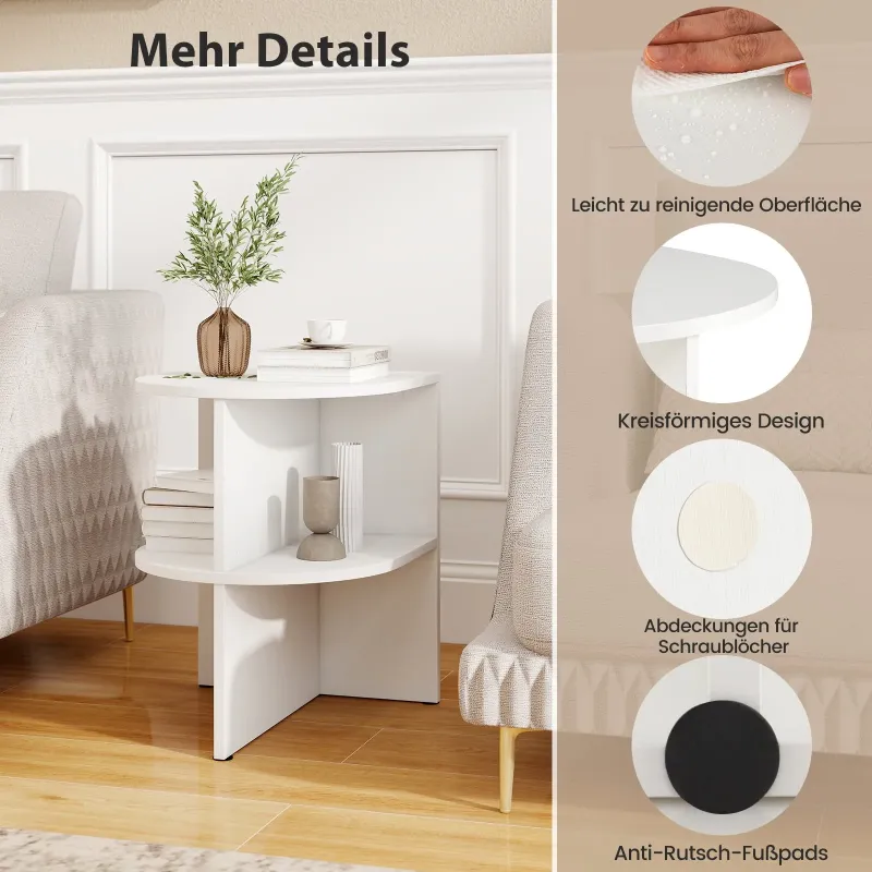 Tento půlkruhový odkládací stolek je praktickým a elegantním úložným řešením, které nezabírá místo. Díky kompaktním rozměrům 38 x 38 x 48,5 cm je ideální do stísněných prostor a má dvě police pro pohodlné uložení věcí. Jeho elegantní půlkruhový design umožňuje nejen flexibilní kombinaci s větším konferenčním stolkem, ale také se dobře hodí do různých interiérů. Další promyšlené detaily, jako je snadno čistitelný povrch a krytky otvorů pro šrouby, dodávají stolu styl a pohodlí. Protiskluzové nožičky navíc zajišťují stabilitu při odpočinku. Vlastnosti: Praktické úložné prostory: Tento půlkruhový odkládací stolek má prostornou desku a dvě otevřené police, které poskytují ideální místo pro knihy, květináče, ozdoby a obrazové rámy, což umožňuje organizované ukládání věcí. Flexibilní kombinace: Díky svému půlkruhovému tvaru lze tento odkládací stolek k pohovce flexibilně uspořádat. Doporučujeme použít každý kus jako samostatný odkládací stolek nebo zkombinovat dva stolky a vytvořit tak konferenční stolek, který je ideální pro umístění před pohovku. Uživatelsky přívětivý design: Tento odkládací stolek ve tvaru půlměsíce, navržený s ohledem na vaše pohodlí, se vyznačuje snadno čistitelným povrchem pro nízkou údržbu, včetně krytek otvorů pro šrouby pro lepší vzhled a protiskluzových nožiček pro zajištění bezpečnosti. Estetický vzhled: Tento noční stolek se vyznačuje inovativním, kulatým designem, který je jednoduchý, ale elegantní, díky čemuž se stane skvělým doplňkem každé místnosti. Doplňuje různé styly interiéru a vylepšuje celkovou estetiku. Všestranné použití: Díky kompaktním rozměrům 38 x 38 x 48,5 cm, které se hodí do stísněných prostor, se tato půlkruhová úložná jednotka pohodlně vejde do stísněných prostor vašeho obývacího pokoje, ložnice nebo kanceláře jako praktické úložné řešení. Praktický úložný prostor: Každý půlkruhový odkládací stolek má prostornou desku a 2 otevřené police, které poskytují ideální místo pro knihy, květináče, ozdoby a obrazové rámy, a umožňují tak organizované úložné prostory. Flexibilní kombinace: Díky půlkruhovým tvarům lze tyto odkládací stolky flexibilně uspořádat. Doporučujeme použít každý kus jako samostatný odkládací stolek nebo zkombinovat dva stolky a vytvořit tak konferenční stolek, který se perfektně hodí k umístění před pohovku. Uživatelsky přívětivý design: Tyto odkládací stolky byly navrženy s ohledem na vaše pohodlí a mají snadno čistitelný povrch pro nízkou údržbu, krytky otvorů pro šrouby pro lepší vzhled a protiskluzové nožičky pro zajištění bezpečnosti. Estetický vzhled: Tyto noční stolky se vyznačují inovativním kruhovým designem, který je jednoduchý, ale elegantní, díky čemuž se stanou skvělým doplňkem v každé místnosti. Doplňují různé styly interiéru a vylepšují celkovou estetiku. Všestranné použití: Díky kompaktním rozměrům 38 x 38 x 48,5 cm pro malé prostory se tyto půlkruhové úložné police pohodlně vejdou do stísněných prostor vašeho obývacího pokoje, ložnice nebo kanceláře jako praktické úložné řešení. Vlastnosti: Velká deska stolu a 2 otevřené police pro pohodlné ukládání Lze použít jako samostatný stůl nebo zkombinovat do konferenčního stolku Snadno se čistí s hladkým povrchem Krytky otvorů pro šrouby pro větší estetiku Zlepšená stabilita s protiskluzovými nožičkami Aerodynamický kulatý design dodává nádech elegance Vhodné do obývacího pokoje, ložnice a kanceláře Nutná montáž