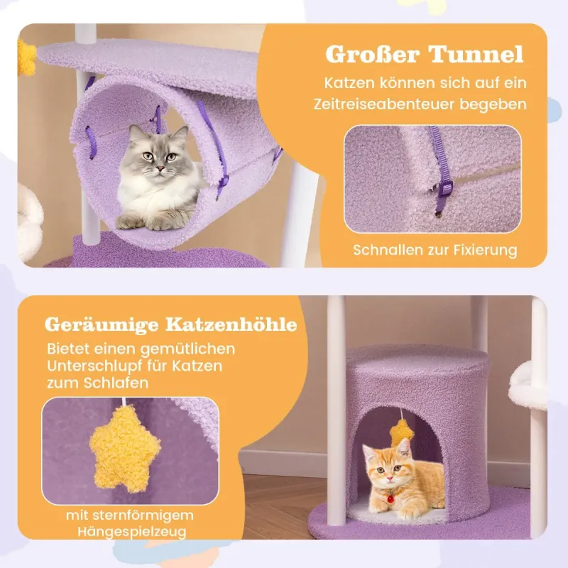 Roztomilá věž pro kočky okamžitě upoutá pozornost každého svým atraktivním vzhledem. Velká vyhlídková plošina ve tvaru měsíce se 2 hracími míčky umožňuje kočkám dívat se na své království nebo do nebe. Velká jeskyně nabízí útulné útočiště pro odpočinek. Kromě toho mají 2 bílá hrazdička okraje ve tvaru mráčku, které zabraňují uklouznutí. Je vybavena ochranou proti převrácení, velkou základnou a robustními kovovými sloupky, které zajišťují potřebnou stabilitu. Domek pro kočky v interiéru je potažen plyšovou tkaninou, která zaručuje měkké prostředí bez alergenů pro vaše domácí mazlíčky. Atributy: 1: Víceúrovňové hrací centrum: centrum aktivit pro kočky je vybaveno velkou vyhlídkovou plošinou ve tvaru měsíce a umožňuje kočkám odpočívat a pozorovat okolí. Tuto funkci doplňují 2 velké skákací plošiny a 2 hrazdičky s okraji ve tvaru obláčku. Podnětné hraní: Vícepatrové vnitřní škrabadlo umožňuje kočkám začít dobrodružství prozkoumáním tunelu, který je vybízí k objevování a hraní. Kromě toho 2 hračky ve tvaru hvězdy a 2 odnímatelné plyšové hračky zajistí, že kočky budou mít zvědavost a zabaví se na dlouhé hodiny. Pohodlné ležení: Tato rozkošná věž pro kočky má prostornou jeskyni, která kočkám poskytuje ideální místo k odpočinku a relaxaci. Moderní šplhací strom pro kočky je navíc potažen měkkou a k domácím mazlíčkům šetrnou plyšovou tkaninou, takže se vaši chlupatí přátelé budou na tomto útulném místě cítit naprosto v pohodě. Robustní konstrukce pro bezpečnost: Moderní věž pro kočky je vybavena ochranou proti převrácení a mimořádně velkou základnou, takže je pro kočky bezpečnou volbou. Konstrukce je dále vyztužena robustními kovovými sloupky, které zajišťují odolnost a stabilitu i při živé hře. Atraktivní vzhled: Toto vysoké škrabadlo v sobě integruje mnoho prvků souvisejících s oblohou a nebesy, které vaše kočky okamžitě zaujmou. Navíc živé barevné provedení škrabadla dodá vašemu pokoji svěží nádech. Vlastnosti: Škrabadlo je vhodné pro děti od 3 let: Velká vyhlídková plošina ve tvaru měsíce poskytuje pozorovací bod 2 závěsné hračky s nebeskou tematikou jsou odnímatelné a lze je používat samostatně Prostorná jeskyně se závěsnými hračkami ve tvaru hvězd poskytuje zábavu a odpočinek Velký tunel s přezkami pro upevnění umožňuje houpání a zkoumání Plošina ve tvaru mraků a velká obdélníková plošina podporují pohyb koček Vybaveno ochranou proti převrácení, která zabraňuje možným nehodám Extra široká základna zajišťuje stabilní postavení věže pro kočky bez kývání Kovové podpěrné sloupky posilují celkovou odolnost