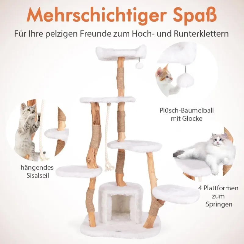 Dieser kunstvoll gestaltete Katzenbaum verfügt über natürliche Birnenholzstämme mit einzigartigen Maserungen, die nicht nur die ästhetische Anziehungskraft erhöhen, sondern auch eine stabile und sichere Struktur bieten, auf der Ihre Katze spielen und erkunden kann. Er enthält eine komfortable Katzenhöhle für private Ruhepausen, einen gemütlichen oberen Liegeplatz zum Entspannen und Beobachten, Jutekratzsäulen zum Krallenschärfen, einen Plüschball und ein hängendes Seil für interaktiven Spaß und bietet mehrere Ebenen des Vergnügens. Darüber hinaus ist jede Plattform mit hochwertigem Langplüschstoff überzogen, der Ihrer Katze unvergleichlichen Komfort und Weichheit für die Entspannung bietet. Attribute: Natürliche Massivholzstämme: Der Katzenbaum verfügt über echte natürliche Birnenholzstämme, die verformungsbeständig und zuverlässig sind und eine sichere und stabile Struktur bieten. Außerdem besitzt jeder Stamm einzigartige Maserungen, wodurch jeder Katzenbaum ein Unikat ist. Mehrstufiger Spaß: Dieser 168 cm hohe Holzkatzenturm ist mit 6 Ebenen ausgestattet, auf denen Ihre pelzigen Freunde klettern können. Außerdem gibt es 4 Sprungplattformen für spielerische Sprünge, einen Plüschball mit Glocke für zusätzlichen Spaß und ein hängendes Sisalseil für aktives Spielen. Gemütliche Ruhebereiche: Dieses Katzenmöbel bietet eine komfortable Katzenhöhle, die einen abgeschiedenen und gemütlichen Rückzugsort für Ihre Katze zum Entspannen oder für ein Nickerchen bietet. Zusätzlich gibt es einen gepolsterten oberen Liegeplatz, von dem aus Ihre Katze die Umgebung beobachten oder sich im Sonnenlicht räkeln kann. Luxuriöser Komfort: Jede Plattform ist mit langem Plüschstoff überzogen und bietet eine luxuriös weiche Haptik, die Ihre pelzigen Begleiter verwöhnt. Die gemütliche Textur schafft eine warme und einladende Umgebung, in der sich Ihre Katze einkuscheln, schlafen oder spielen kann. Natürliche Jutekratzsäulen: Die Stützsäulen sind mit Kratzseilen umwickelt, die es Katzen ermöglichen, ihre Krallen zu schärfen und ihren natürlichen Instinkt auszuleben. Außerdem sind die Seile aus natürlichem Jute gefertigt, was sie kratzfest, verschleißfest, sicher und gesund macht. Eigenschaften: Jeder Birnenholzstamm ist in Form und Maserung einzigartig Die Massivholzstämme bieten hervorragende Haltbarkeit und Stabilität Kommt mit 2 großen und 2 kleinen Plattformen zum Ausstrecken und Entspannen Beinhaltet eine große Katzenhöhle, die einen privaten und sicheren Ruheplatz bietet Der obere Liegeplatz mit erhöhtem Rand sorgt für ein sicheres Liegeerlebnis Der klingelnde Ball und das hängende Sisalseil fördern Verspieltheit und Bewegung Die Jutekratzsäulen ermöglichen es den Kätzchen, den Kratztrieb auszuleben Die Säulen sind mit natürlichen Juteseilen umwickelt, sicher und tierfreundlich Mit Langplüsch überzogen, bietet Ihrer Katze Weichheit und Wärme