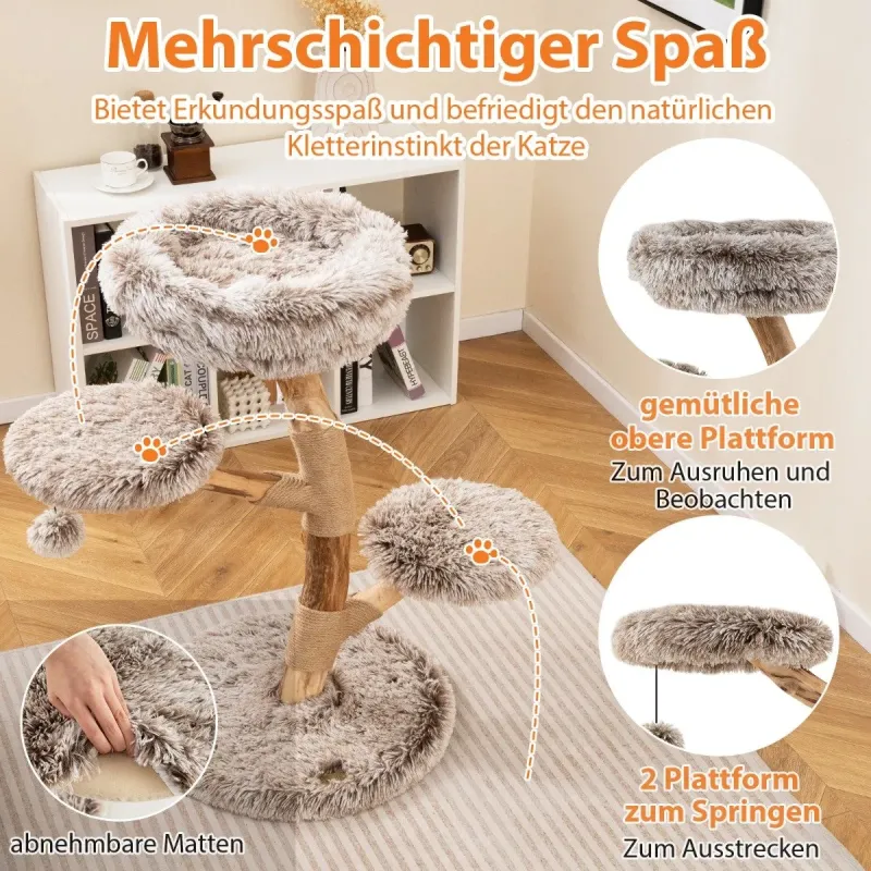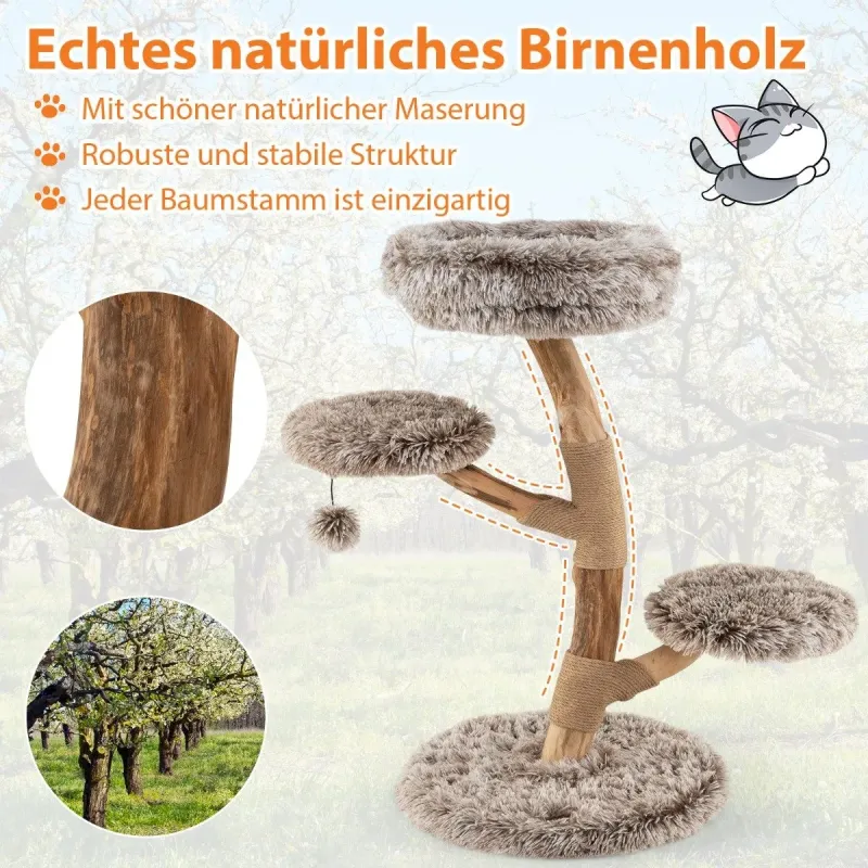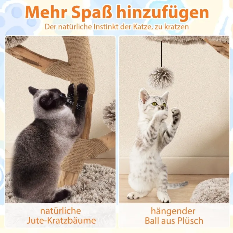 Zhýčkejte svou kočku naším škrabadlem z hruškového dřeva! Díky tvrdému, robustnímu dřevu a jedinečně krásné přírodní kresbě nabízí nejen robustní a jedinečnou konstrukci, ale také vícevrstvou hrací plochu, která uspokojí přirozené instinkty vaší kočky ke šplhání. Díky čtyřem úrovním hraní, včetně útulné vyhlídkové plošiny a dvou plošin na skákání, mohou kočky zkoumat a odpočívat v luxusním pohodlí. Měkký, dlouhý plyšový potah poskytuje extra pohodlí a nabízí měkké, teplé místo, ideální pro spánek nebo aktivní hru. Sloupky z přírodní juty a hravý houpací míč poskytují další zábavu. Ty podporují instinkt vaší kočky ke škrábání a zároveň zajišťují bezpečnost díky široké, vyztužené základně a zařízení proti převrácení. Nejedná se pouze o škrabadlo, ale o důležitou součást vašeho domova, která vašim milovaným kočkám nabízí bezpečí, zábavu a pohodlí. Atributy: 1: Pravé hruškové dřevo: Toto škrabadlo je vyrobeno z tvrdého a robustního hruškového dřeva a nabízí pevnou a stabilní konstrukci. Díky jeho přírodní, krásné kresbě je každý kus jedinečný pro váš domov. Vícevrstvá zábava na hraní: Kočičí věž se čtyřmi úrovněmi nabízí vzrušující průzkumné výlety a podporuje přirozený instinkt vaší kočky ke šplhání. Skládá se z útulného posezení v horní části, sedátka pro odpočinek s výhledem do okolí a dvou skákacích plošin pro protažení. Luxusní pohodlí: Hrací věž je potažena kvalitním dlouhým plyšem a nabízí měkký a pohodlný zážitek, který hýčká vaši kočku svou měkkostí a teplem. Plyšová struktura vybízí vaši kočku k příjemnému zdřímnutí nebo hraní. Více zábavy: Centrum aktivit pro kočky je vybaveno jutovými sloupky odolnými proti poškrábání a opotřebení. Závěsný plyšový míček se houpe a skáče a poskytuje další vzrušení. Tyto prvky uspokojí přirozený instinkt vaší kočky ke škrábání. Maximální stabilita: Škrabadlo má širokou a zesílenou základnu, která zajišťuje stabilitu a zabraňuje jeho převrácení. O větší bezpečnost se stará protiskluzová pojistka. Polštářky jsou odnímatelné, a proto se snadno čistí a udržují v čistotě. Vlastnosti: Každý kmen z přírodního hruškového dřeva má jedinečný tvar a vzor. Masivní dřevěné kmeny zajišťují odolnost a stabilitu. Se 4 úrovněmi pro rozmanitou zábavu a objevování. Obsahuje útulné sedátko pro odpočinek. Vybaven 2 skákacími plošinami pro protahování a hraní. Potaženo měkkou, dlouhou plyšovou tkaninou pro výjimečné pohodlí. Sloupky jsou omotány přírodním jutovým provazem, který je odolný a bezpečný. Plyšový míč vybízí ke hře a cvičení. S ochranou proti převrácení pro větší bezpečnost. Odnímatelné podložky pro snadné čištění a údržbu. Každá úroveň unese 10 kg.