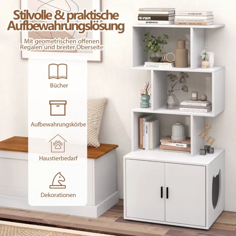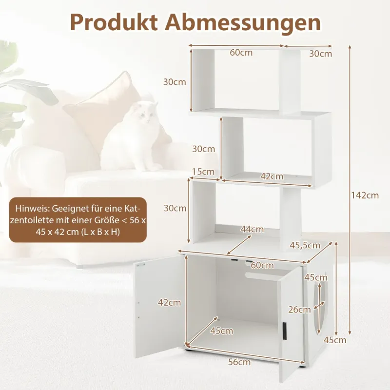 Naše ohrádka na stelivo nabízí vašim kočkám prostorné a čisté prostředí pro jejich práci! Díky uzavřené skříňce mohou kočky vykonávat svou činnost v soukromém úkrytu. Je také vybavena 3 větracími otvory, které minimalizují šíření nepříjemných pachů. Skříňka pro domácí mazlíčky je zároveň úložným prostorovým zázrakem. Tři geometrické otevřené police poskytují stylové a praktické úložné řešení, do kterého můžete uložit stelivo, lopatky a věci denní potřeby. Z bezpečnostních důvodů je vysoká skříň pro kočky dodávána se zařízením proti převrácení, které zajišťuje její stabilitu a zabraňuje nehodám způsobeným převrácením. Kromě toho 4 nastavitelné podložky pod nohy zajišťují stabilitu velkého domku pro kočky. Díky jedinečným geometrickým otevřeným policím a rustikálnímu dřevěnému povrchu dodá dekorativní domek pro domácí mazlíčky vašemu pokoji šarm. Atributy: 1: Umožňuje kočkám užít si čas strávený na toaletě: Uzavřená skříňka poskytuje vyhrazený prostor pro kočičí soukromí a je dokonalým řešením, jak minimalizovat stopy po stelivu. Kromě toho 3 větrací otvory ve skříňce umožňují dostatečné větrání a minimalizují nepříjemné pachy. Praktické řešení úložného prostoru: 3 velké otevřené police a široká horní část skříňky poskytují dostatek prostoru pro uložení dekorací, knih, košů nebo potřeb pro domácí mazlíčky na dosah. Skříňka na stelivo tak poskytuje dobře organizovaný koutek pro péči o domácí mazlíčky. Stabilní a bezpečná konstrukce: Skříňka pro kočky s úložným prostorem má sadu proti převrácení, která zajišťuje vynikající stabilitu a zabraňuje nehodám způsobeným převrácením. Velký kočičí domek navíc pevně stojí na jakémkoli povrchu díky 4 nastavitelným podložkám pod nohy. Stylový a elegantní design: Díky estetickým geometrickým policím bude nábytek v podobě domečku pro zvířata poutat pozornost, ať už ho umístíte kamkoli. Celkově hladké bílé provedení bez námahy doplní různé dekorativní motivy. Stylový a moderní design: Díky esteticky příjemným geometrickým policím bude nábytek do domku pro zvířata poutat pozornost, ať už ho umístíte kamkoli. Celkově moderní hnědá povrchová úprava bez námahy ladí s různými dekoračními motivy. Vhodná velikost kočkolitu: Celkové rozměry velké skříně pro kočky jsou 60 x 45,5 x 142 cm (d x š x v). Vnitřní rozměry uzavřené skříňky jsou 56 x 45 x 42 cm (d x š x v). Před zakoupením se prosím ujistěte, že je velikost vašeho kotce menší. Vlastnosti: Vnitřní prostor je vybaven speciálními dveřmi, které jsou součástí balení: Skříňka s úkrytem a 3 větracími otvory snižuje rozptyl steliva a zápachu Dodává se s geometrickými otevřenými policemi a širokou horní deskou, aby bylo vše přehledně uloženo Roztomilý boční vchod poskytuje snadný přístup pro chlupaté přátele Díky sadě proti převrácení se nebude snadno kývat ani převracet Nastavitelné podložky pod nohy zlepšují rovnováhu vysoké skříňky pro kočky Zvýšená přepážka na desce stolu zabraňuje vypadávání předmětů, Magnetické úchyty dvířek a praktické úchyty usnadňují zavírání dvířek Snadno čistitelný povrch umožňuje bez námahy udržovat bezvadný vzhled