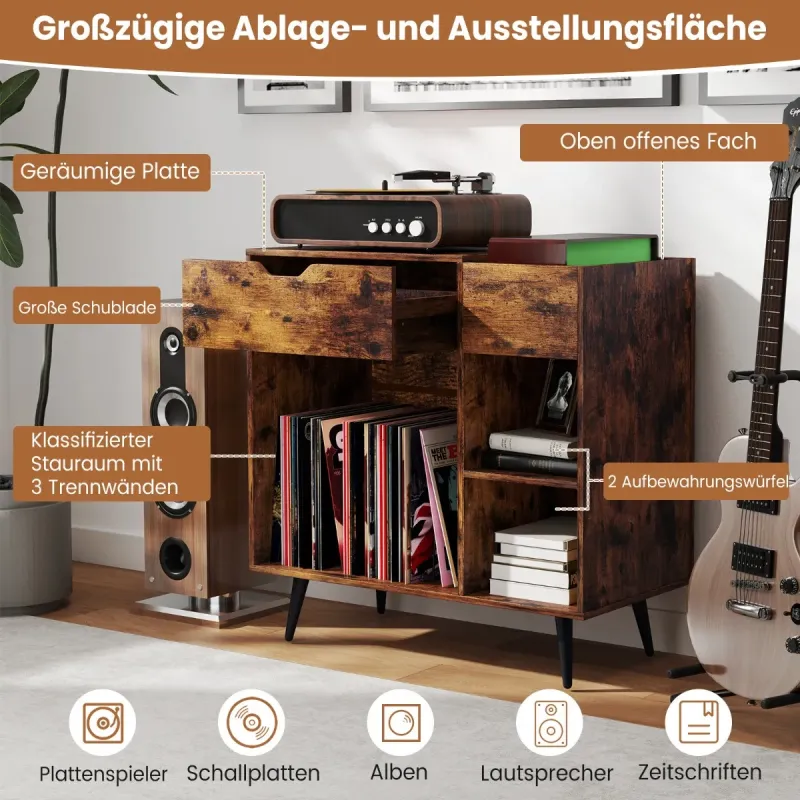 Náš všestranný stojan na gramofon vám poskytne vylepšený zážitek z vinylu. Se širokým povrchem pro váš gramofon a příslušenství, velkou otevřenou přihrádkou s odnímatelnými přepážkami pro organizaci alb, zásuvkou a dalšími policemi pro organizaci, pohodlnou nabíjecí stanicí pro více zařízení, otvorem pro kabel, který zabraňuje chaosu v kabelu, robustními kovovými nohami a 2 sady proti naklonění pro stabilitu a dlouhou životnost. Stojan je vhodný do obývacího pokoje nebo ložnice, kombinuje funkčnost se stylem. Ideální pro milovníky vinylu, kteří oceňují organizaci a estetiku. Vlastnosti:Velký úložný prostor: Stojan gramofonu má otevřenou přihrádku s odnímatelnými přepážkami, které poskytují flexibilní úložný prostor pro vaši sbírku vinylů nebo jiná média. Široká horní deska, výsuvná zásuvka a police po stranách jsou ideální pro vystavení desek nebo dekorací. Zapuštěný napájecí port: Vestavěná nabíjecí stanice obsahuje 2 zásuvky, 1 USB a 1 port Type-C, takže můžete napájet reproduktory nebo nabíjet zařízení při poslechu svých oblíbených desek. Otvor pro kabel navíc zajišťuje, že jsou kabely úhledně schované a mimo dohled. Stabilní konstrukce: Stojan na desky je postaven na pevných kovových nohách a má stabilní základnu pro dlouhodobé používání. Navíc 2 sady proti překlopení poskytují extra bezpečnost tím, že pevně zajišťují stojan gramofonu na místě. Široké použití: Tato úložná skříň je nezbytným prvkem pro milovníky hudby a technických nadšenců, protože poskytuje stylové a praktické řešení pro váš obývací pokoj nebo ložnici. Rustikální kresba dřeva zvyšuje estetickou přitažlivost každé místnosti. Dbáme na každý detail: vyříznuté madlo a hladké kovové kolejnice umožňují pohodlné otevírání a zavírání zásuvky. Zvýšené opěrné nohy ponechávají dostatek prostoru pro vysavač, hladký povrch umožňuje snadnou údržbu. Vlastnosti:Vestavěná nabíjecí stanice pro snadné nabíjení více zařízení Otvor pro správu kabelů udržuje uklizené kabely Široký povrch skříně pro uložení gramofonů a stereo reproduktorů Úložná zásuvka a police pojmou různé položky Funkce přepážky pro kategorizované skladování knih a dekorací Pevná a spolehlivá konstrukce vydrží ist2 sady proti převrácení zabraňují kývání a zvyšují bezpečnost Robustní kovové nohy, které se snadno nedeformují nebo nekývají
